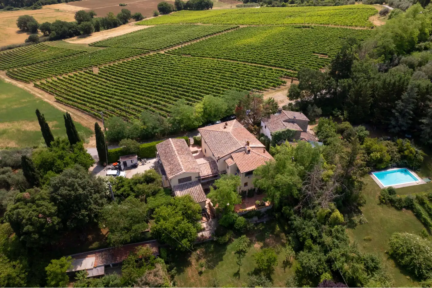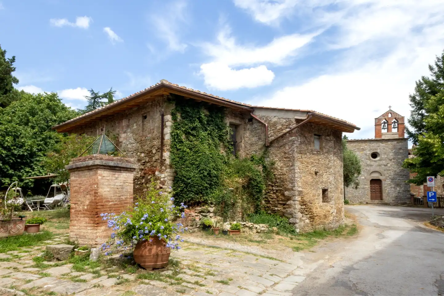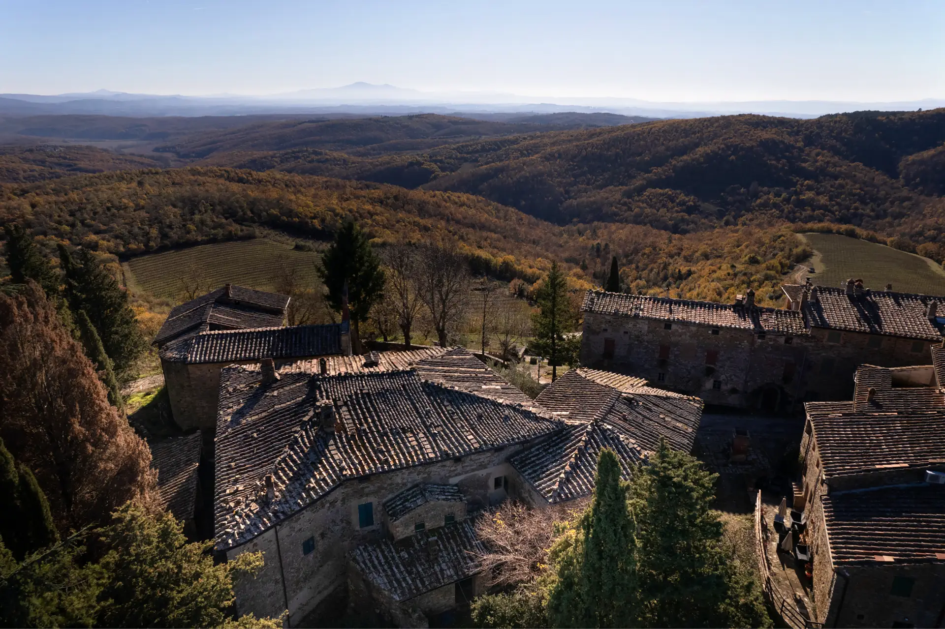 Set in the heart of Florence’s rolling hills, the estate looks out across the world-renowned Chianti Classico DOCG vineyards, where centuries of winemaking tradition meet breathtaking landscapes. Just beyond, an ancient monastery from 890 AD stands as a reminder of Tuscany’s enduring heritage, while nearby villages provide all daily essentials with authentic local character.
