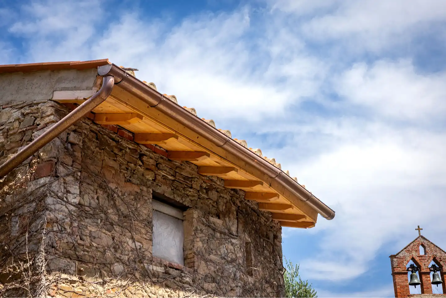 We carried out a complete roof reconstruction using wood throughout rather than the wood-and-terracotta combination typical of other restorations. This approach offers a subtle reinterpretation of the original design.