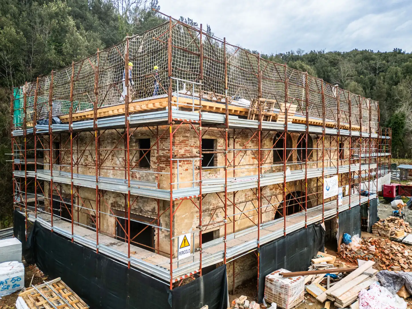 At Montalbiolo Carmignano, our team managed the design and structural works of a comprehensive seismic risk reduction project. The 19th-century complex, once barns and cellars serving a nearby manor house, required extensive consolidation to ensure safety and durability.